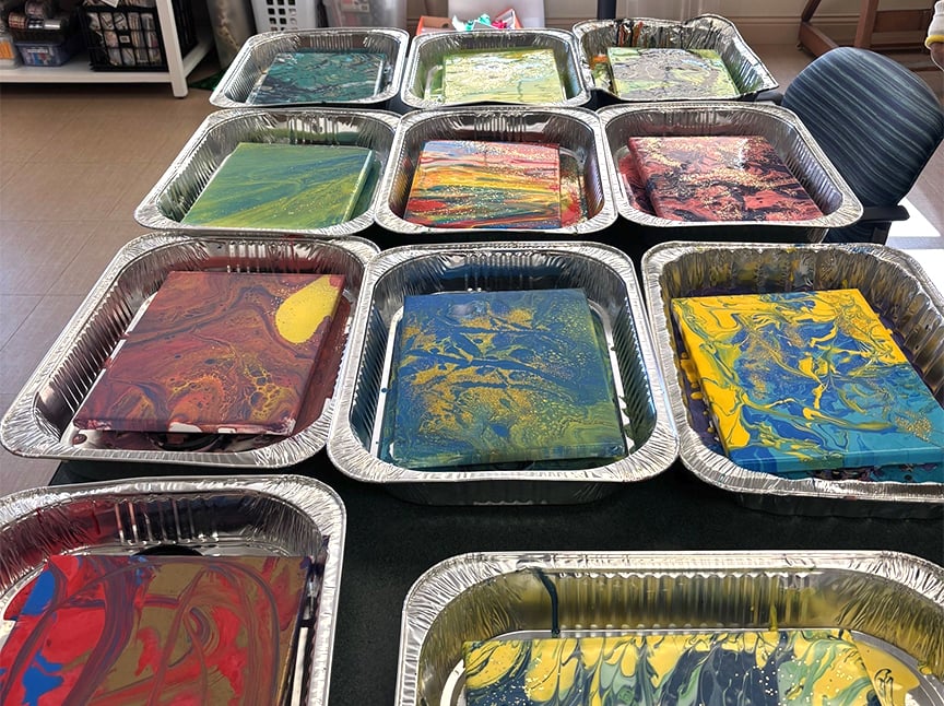 Residents participated in a style of art marking called Poured Painting. It’s a fun and interesting artistic style that uses acrylic paint and a method called Flood, a process that keeps the paint moving until it dries. The unique aspect of this painting style is that how the canvas looks once the artist stops painting is different from how it looks once dry. It was a fascinating and art-filled time.